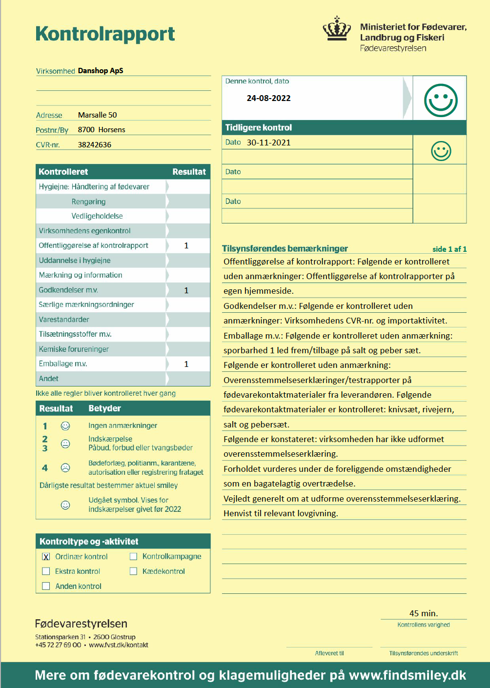 Fødevarekontrollen kommer forbi minimum 1 gang årligt. Vi har indsat seneste kontrolrapport. Ønsker du at se tidligere rapporter, kan du finde dem her