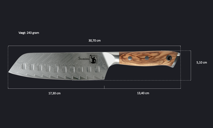 Art Santokukniv i 67 lags damaskus stål På billedet ved siden af, finder du vægt og alle mål på Art grøntsagskniv / santokukniv i damaskus stål. Hvis der er nogle mål du mangler, eller andre spørgsmål du måtte side med inden du er klar til at bestille din nye yndlingsknive, så kontakt os på +45 53 33 5000 eller mail info@sumisu.dk
