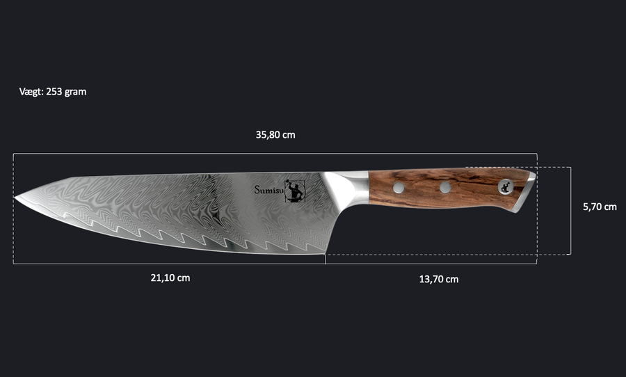 Art kokkekniv i 67 lags damaskus stål På billedet ved siden af, finder du vægt og alle mål på Art kokkekniv i damaskus stål. Hvis der er nogle mål du mangler, eller andre spørgsmål du måtte side med inden du er klar til at bestille din nye yndlingsknive, så kontakt os på +45 53 33 5000 eller mail info@sumisu.dk