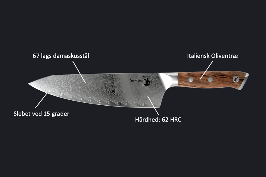 67 lag Vi har ladet alle vores køkkenknive opbygge med den samme stærke 67 lags damaskusstål. Damaskusstålet er ombygget omkring kernen i kniven. Kernen er det inderste lag og på denne ligger der 33 lags rustfrit stål på hver side. Tilsammen giver dette 67 lag. Vores damaskusstål produceres med moderne teknologi, hvor man styrer varmen under produktionen meget præcist. Dette gør at damaskusstålet bliver stærkere og mere hårdført.