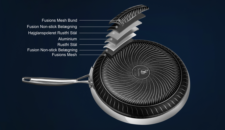 Stegepande, wok og gryder Hele Fusion non-stick serien er opbygget på samme måde. Vi har forsøgt at vise opbygningen af vores produkt - men uden at fortælle alle hemmelighederne. Indvendig i vores Fusion non-stick serie møder dine køkkenredskaber (om de er metal eller ej) det øverste lag som er rustfri stål. Lige under den rustfri stål er vores patenterede non-stik belægning. Alle vores produkter er fri for ulovlige kemikalier og råvarer.