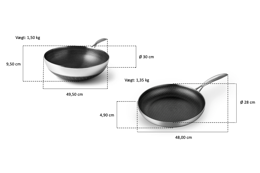 På kun 1,35 kg og 1,50 kg er stegepanden og wok utrolige nemme at håndtere og arbejde med. Det har været vigtigt for udviklingen af vores stegepande og wok, at de ikke bliver tung og uhandy. Derfor har vi nøje udvalgt råmaterialerne for, at kunne lave en letvægts non-stick stegepande og wok med alle de gode egenskaber.