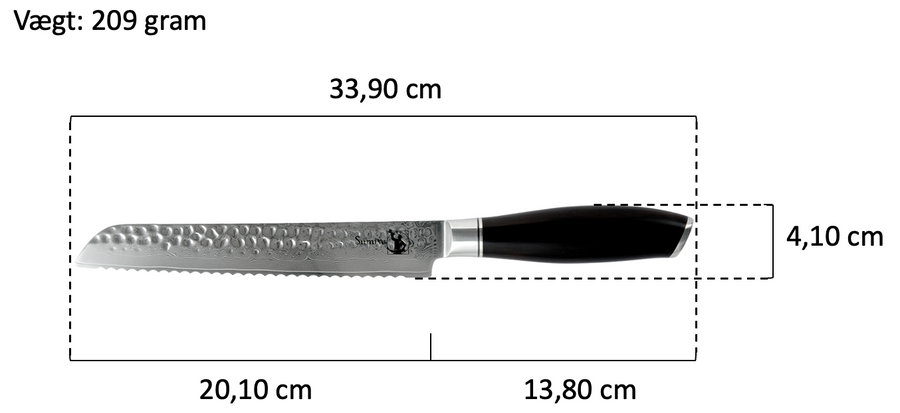 Kaki brødkniv i 67 lags damaskus stål På billedet ved siden af, finder du vægt og alle mål på Kaki brødkniv i damaskus stål. Hvis der er nogle mål du mangler, eller andre spørgsmål du måtte side med inden du er klar til at bestille din nye yndlingsknive, så kontakt os på +45 53 33 5000 eller mail info@sumisu.dk