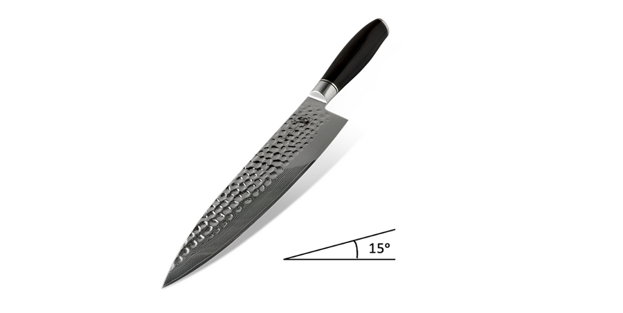 15 grader Vi har testet flere forskellige vinkler på æggen. Laver du den for stor, så bliver kniven sløvere, laver du den før lille, bliver kniven for skrøbelig. Vi har valgt at slibe vores knive med en vinkel på 15 grader. Hvilet vi mener giver en utrolig skarp kniv og en god holdbarhed. Når det er sagt, så skal alle knive slibes efter behov. Vores knive vil også blive sløve med tiden. Hvornår de skal slibes er individuelt og afhænger af, hvor meget og hvordan de bruges.