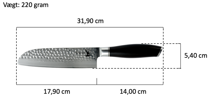 Kaki santoku i 67 lags damaskus stål På billedet ved siden af, finder du vægt og alle mål på Kaki santokukniv / grøntsagskniv i damaskus stål. Hvis der er nogle mål du mangler, eller andre spørgsmål du måtte side med inden du er klar til at bestille din nye yndlingsknive, så kontakt os på +45 53 33 5000 eller mail info@sumisu.dk