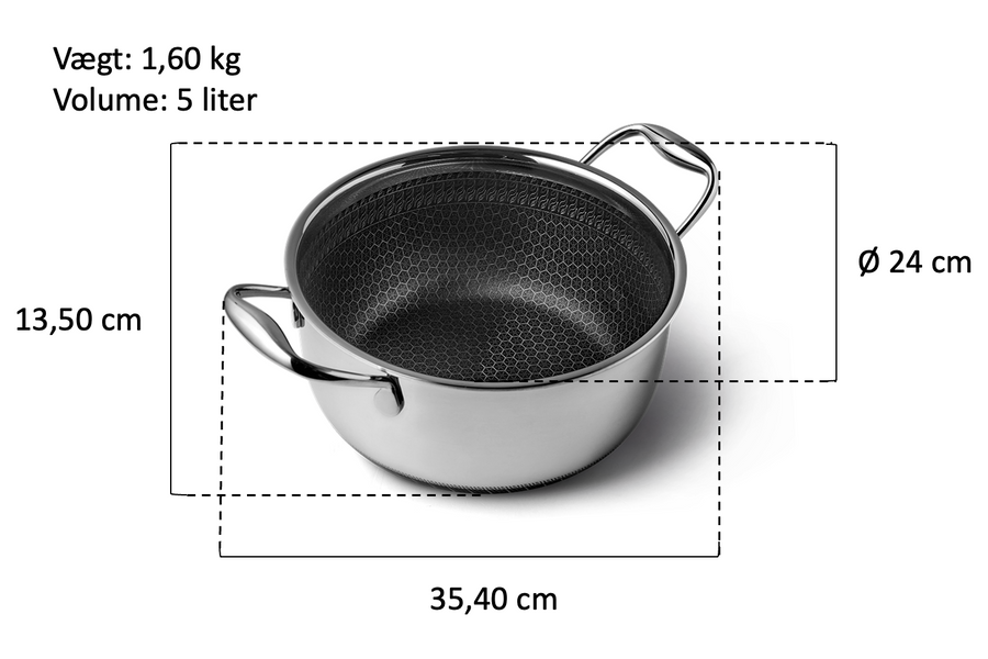 På kun 1,6 kg Gør at gryden utrolig nem at håndtere og arbejde med. Det har været vigtigt for udviklingen af panden ikke bliver tung og uhandy. Derfor har vi nøje udvalgt råmaterialerne for, at kunne lave en letvægts non-stick kasserolle med alle de gode egenskaber. Non-stick gryden vejer kun ca. 1,6 kg uden låg og ca. 2,2 kg med låg.