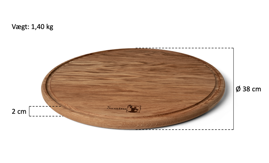 Olieret rundt skærebræt På billedet ved siden af, finder du vægt og alle mål på vores runde skærebræt i olieret eg. Hvis der er nogle mål du mangler, eller andre spørgsmål du måtte side med inden du er klar til at bestille din nye yndlingsknive, så kontakt os på +45 53 33 5000 eller mail info@sumisu.dk
